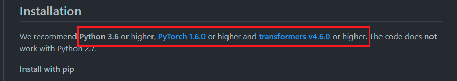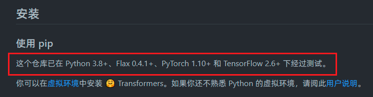 通过Sentence Transformers github页面可知,安装条件,在条件transformers v4.6.0中看到在python3.8+得到测试,为了稳妥起见,我这边使用了python3.9