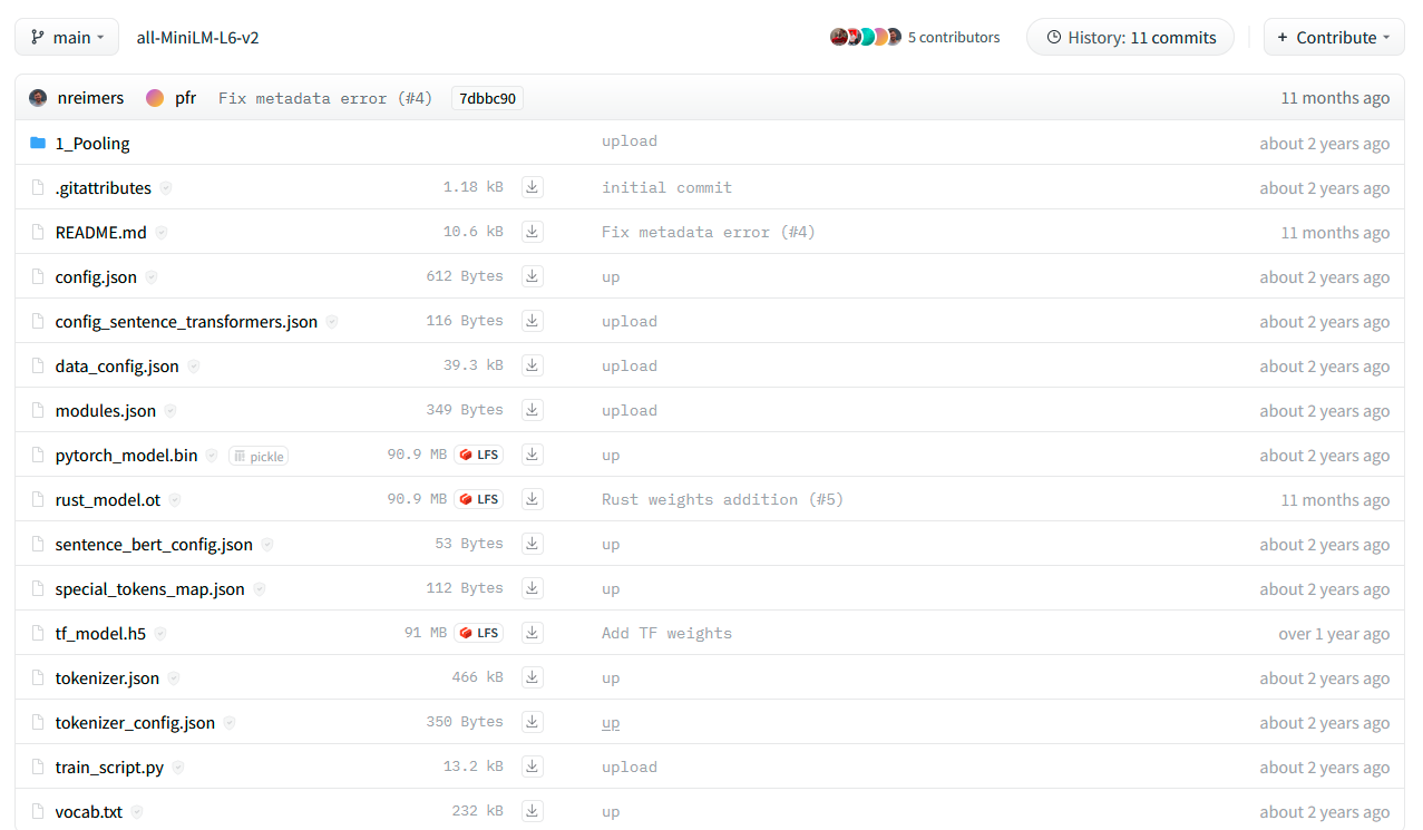 模型地址上述提过:all-MiniLM-L6-v2,按照图中所示下载全部文件,再放到linux指定目录
