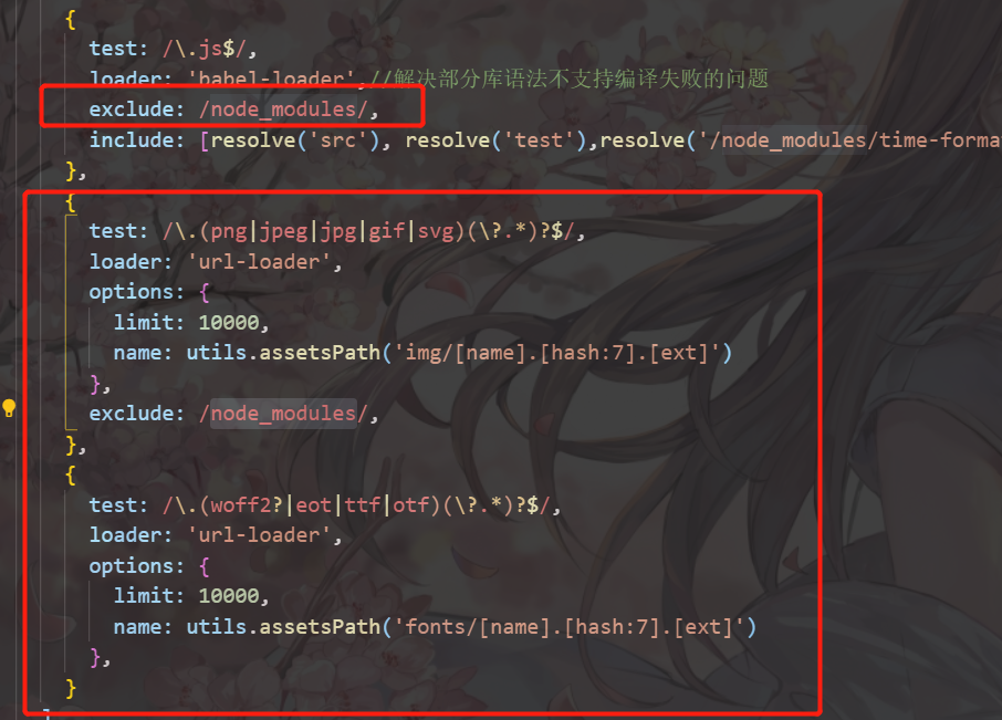 在webpack.base.conf.js的nodule的rules 加上 /node_modules/,避免将node_modules也打包进模块里!