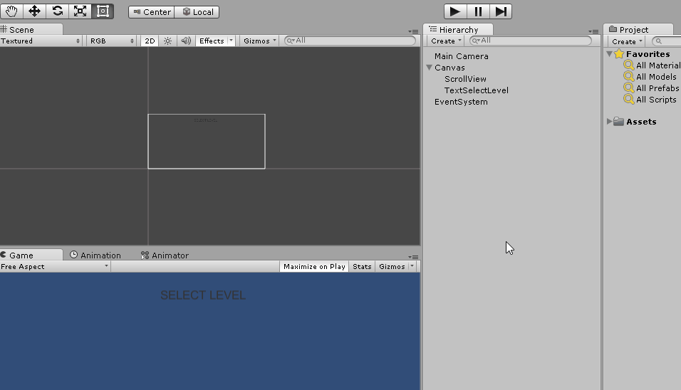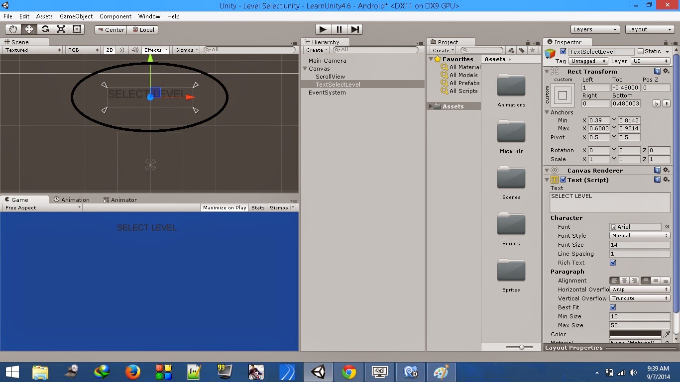 5. Add a Text component within the Canvas we created earlier and name it TextSelectlevel.