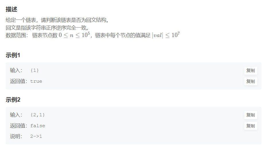 代码的话,要想验证回文,直接找到前中点的结点,然后反转后面的链表,再l1从开始比,l2从以反转的地方开始,直到比完l2就行了。