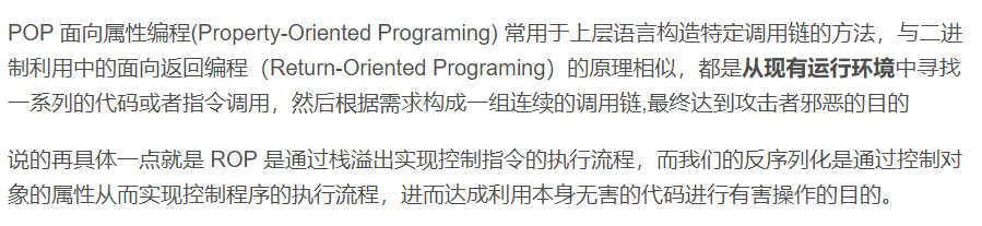 在传入参数pop被设置时对其进行反序列化,那么再查看此前定义的类中哪些具有和反序列化相关的魔术方法,调用这些魔术方法中设置的代码,就可以执行此处反序列化之外更多的代码,从而实现我们读取flag.php中flag的要求。