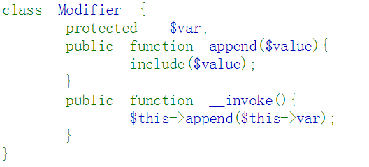 Modifier类中append()方法会将传入参数包含,而此处魔术方法__invoke中设置了将Modifier类中的var属性作为传入值来调用append()函数,所以在这里需要让属性var的值为flag.php,再触发魔术方法__invoke即可。魔术方法__invoke被自动调用的条件是类被当成一个函数被调用,故接着来寻找和函数调用有关的代码。