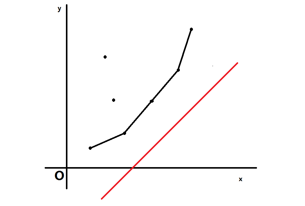 如图,黑色的点为所有 \(0\le j< i\) 的点 \((x_j,y_j)\),红色线为斜率 \(k_i\) 的某条直线。