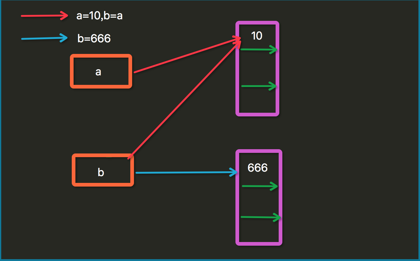 1 a = 10 2 b = a 3 b = 666 4 5 print(a) # 10 6 print(b) # 666