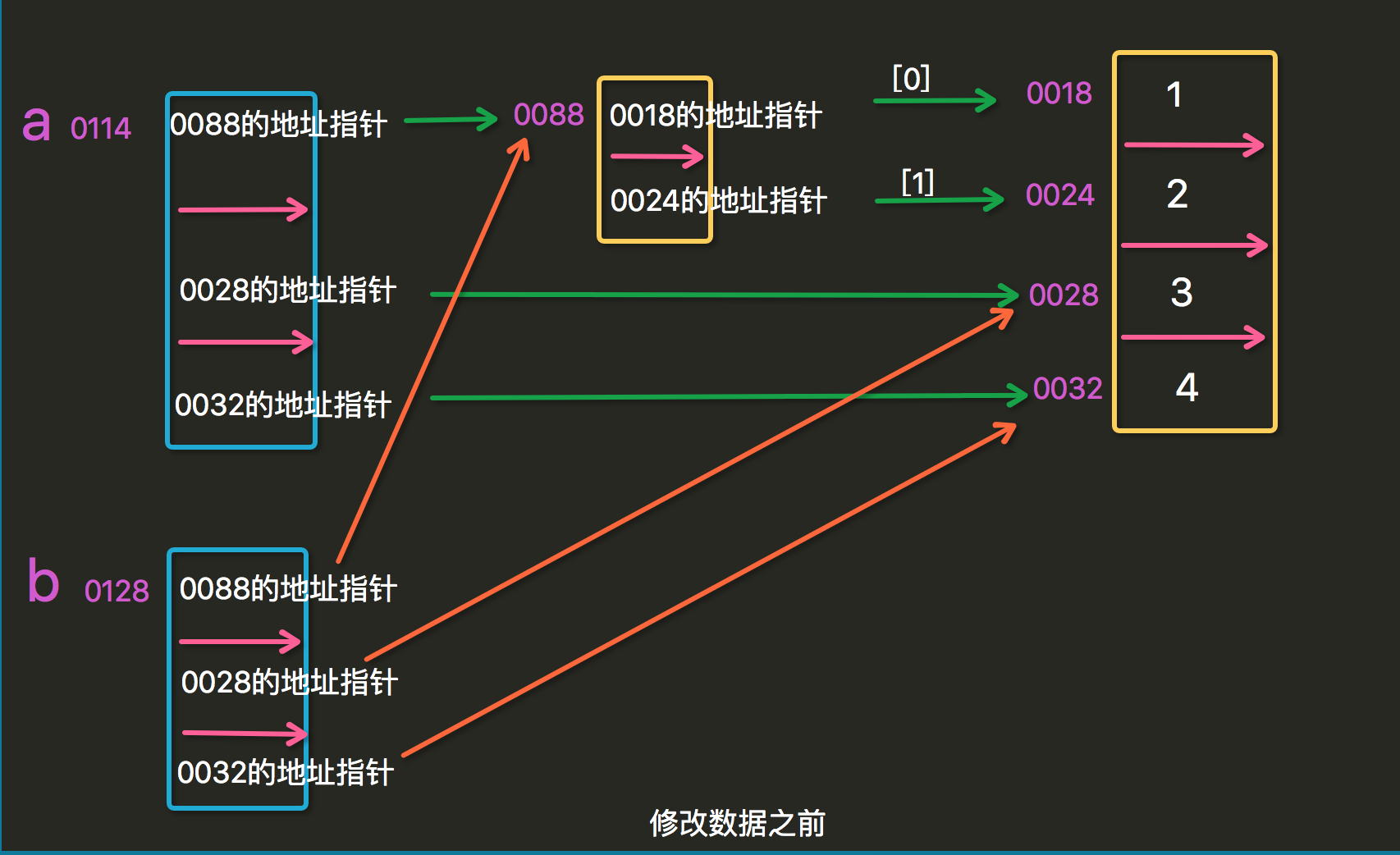 1 # 不可变数据类型:数字,字符串,元祖 2 # 可变类型:列表,字典 3 4 list = [1, 2, 3] 5 6 print(id(list)) # 139692391564104 7 8 list[0] = 4 9 10 print(id(list)) # 139692391564104 11 12 # 你对可变类型进行修改时,比如这个列表对象list,它的内存地址不会变化,注意是这个列表对象list, 不是它里面的元素 13 14 str = 'hello' 15 16 print(id(str)) # 像字符串,列表,数字这些不可变数据类型,,是不能修改的,比如我想要一个'hello的字符串,只能重新创建一个'hello'的对象,然后让指针只想这个新对象 17 18 # str[0] = 'e' 报错 19 20 # 重点: 浅拷贝 21 a=[[1,2],3,4] 22 b=a[:]#b=a.copy() 23 24 print(a,b) 25 print(id(a),id(b)) 26 print('*************') 27 print('a[0]:',id(a[0]),'b[0]:',id(b[0])) 28 print('a[0][0]:',id(a[0][0]),'b[0][0]:',id(b[0][0])) 29 print('a[0][1]:',id(a[0][1]),'b[0][1]:',id(b[0][1])) 30 print('a[1]:',id(a[1]),'b[1]:',id(b[1])) 31 print('a[2]:',id(a[2]),'b[2]:',id(b[2])) 32 33 34 print('___________________________________________') 35 b[0][0]=8 36 37 print(a,b) 38 print(id(a),id(b)) 39 print('*************') 40 print('a[0]:',id(a[0]),'b[0]:',id(b[0])) 41 print('a[0][0]:',id(a[0][0]),'b[0][0]:',id(b[0][0])) 42 print('a[0][1]:',id(a[0][1]),'b[0][1]:',id(b[0][1])) 43 print('a[1]:',id(a[1]),'b[1]:',id(b[1])) 44 print('a[2]:',id(a[2]),'b[2]:',id(b[2]))<br><br><br>#outcome 45 46 # [[1, 2], 3, 4] [[1, 2], 3, 4] 47 # 4331943624 4331943752 48 # ************* 49 # a[0]: 4331611144 b[0]: 4331611144 50 # a[0][0]: 4297375104 b[0][0]: 4297375104 51 # a[0][1]: 4297375136 b[0][1]: 4297375136 52 # a[1]: 4297375168 b[1]: 4297375168 53 # a[2]: 4297375200 b[2]: 4297375200 54 # ___________________________________________ 55 # [[8, 2], 3, 4] [[8, 2], 3, 4] 56 # 4331943624 4331943752 57 # ************* 58 # a[0]: 4331611144 b[0]: 4331611144 59 # a[0][0]: 4297375328 b[0][0]: 4297375328 60 # a[0][1]: 4297375136 b[0][1]: 4297375136 61 # a[1]: 4297375168 b[1]: 4297375168 62 # a[2]: 4297375200 b[2]: 4297375200