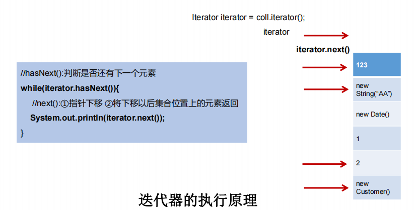 Collection coll = new ArrayList(); coll.add(123); coll.add(456); coll.add(new Person("Jerry",20)); coll.add(new String("Tom")); coll.add(false); Iterator iterator = coll.iterator(); ////hasNext():判断是否还有下一个元素 while(iterator.hasNext()){ //next():①指针下移 ②将下移以后集合位置上的元素返回 System.out.println(iterator.next());