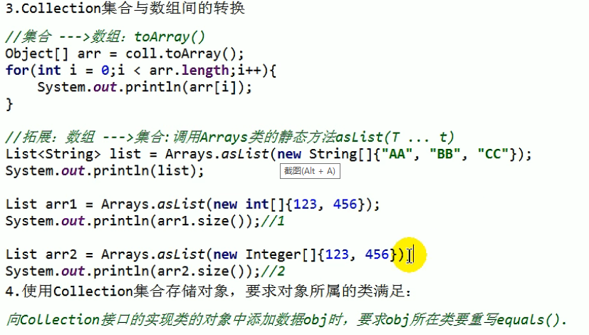 Collection coll = new ArrayList(); coll.add(123); coll.add(456); coll.add(new Person("Jerry",20)); coll.add(new String("Tom")); coll.add(false); //2.containsAll(Collection coll1):判断形参coll1中的所有元素是否都存在于当前集合中。 Collection coll1 = Arrays.asList(123,456); System.out.println(coll.containsAll(coll1));