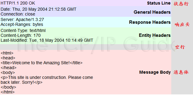 在客户端发送请求后服务端进行响应,将信息发送给客户端,以实现功能服务,报文格式如下(包含状态行、响应头、空行、消息体):