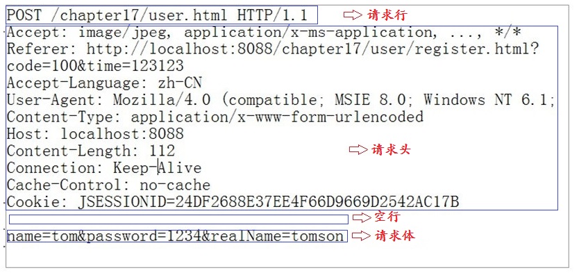 客户端通过HTTP协议进行请求时遵循一定的格式,请看下面的请求报文格式(由请求行、请求头、空行、请求体组成):