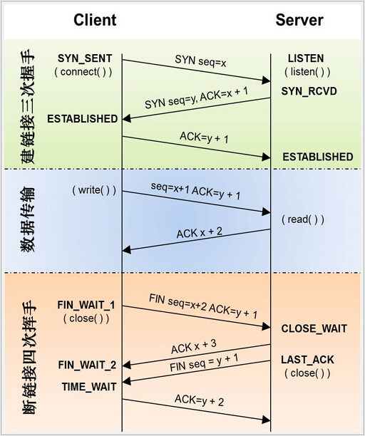 三次握手具体过程(状态)如下(其实可以类比打电话的过程:甲打电话,并等待接听→乙收到来电显示,“并表示可以接听”→“甲收到乙可以接听的信息”,甲接听电话。注:引号部分是打电话过程中没有的,但在TCP三次握手中存在):