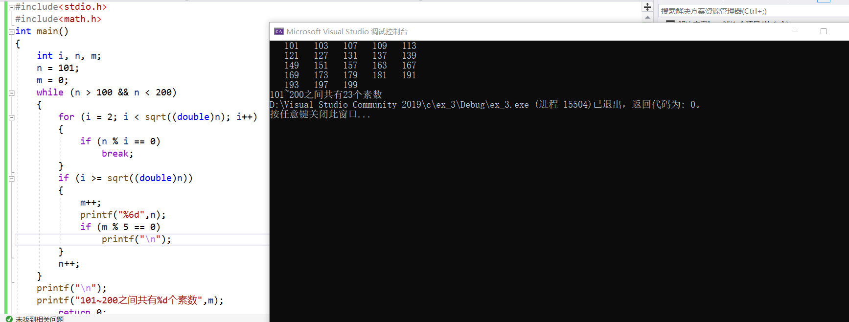 #include<stdio.h> #include<math.h> int main() { int i, n, m; n = 101; m = 0; while (n > 100 && n < 200) { for (i = 2; i < sqrt((double)n); i++) { if (n % i == 0) break; } if (i >= sqrt((double)n)) { m++; printf("%6d",n); if (m % 5 == 0) printf("\n"); } n++; } printf("\n"); printf("101~200之间共有%d个素数",m); return 0; }