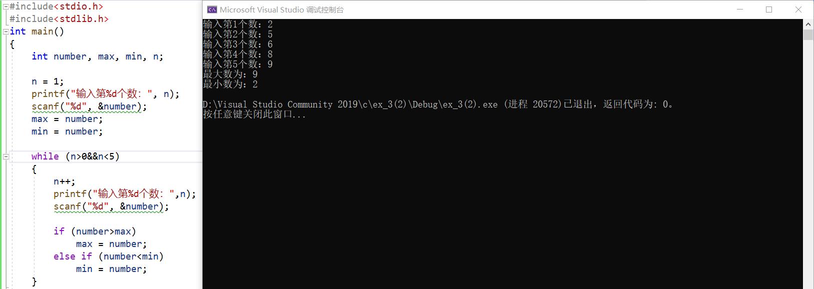#include<stdio.h> #include<stdlib.h> int main() { int number, max, min, n; n = 1; printf("输入第%d个数:", n); scanf("%d", &number); max = number; min = number; while (n>0&&n<5) { n++; printf("输入第%d个数:",n); scanf("%d", &number); if (number>max) max = number; else if (number<min) min = number; } printf("最大数为:%d\n", max); printf("最小数为:%d\n", min); return 0; }