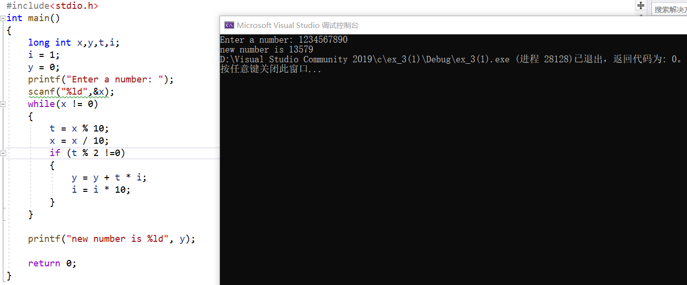 #include<stdio.h> int main() { long int x,y,t,i; i = 1; y = 0; printf("Enter a number: "); scanf("%ld",&x); while(x != 0) { t = x % 10; x = x / 10; if (t % 2 !=0) { y = y + t * i; i = i * 10; } } printf("new number is %ld", y); return 0; }