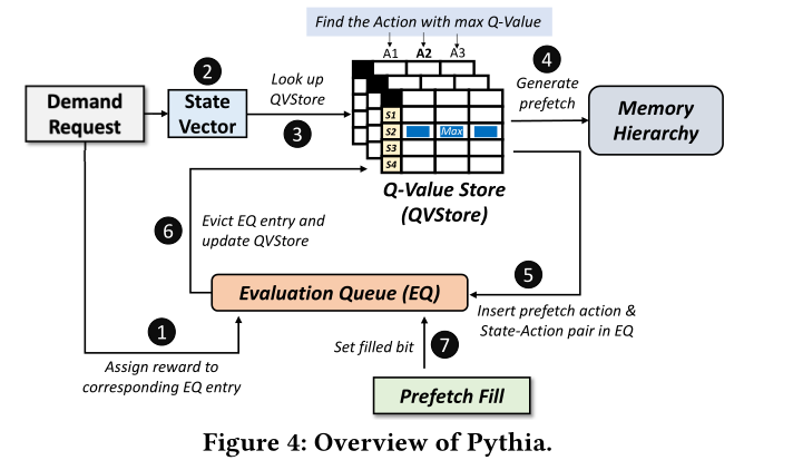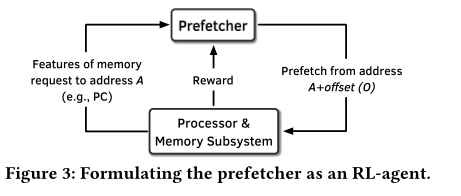 将Pythia定义为一个RL-agent,它通过与处理器和内存子系统交互来自主学习预取。对于每一个新的需求请求,Pythia都会提取一组程序特性。它将特征集作为状态信息,根据之前的经验进行预取操作。对于每一个预取动作(包括不预取),在给定各种系统级反馈信息的情况下,Pythia都会收到一个数值奖励,评估预取动作的准确性和及时性。