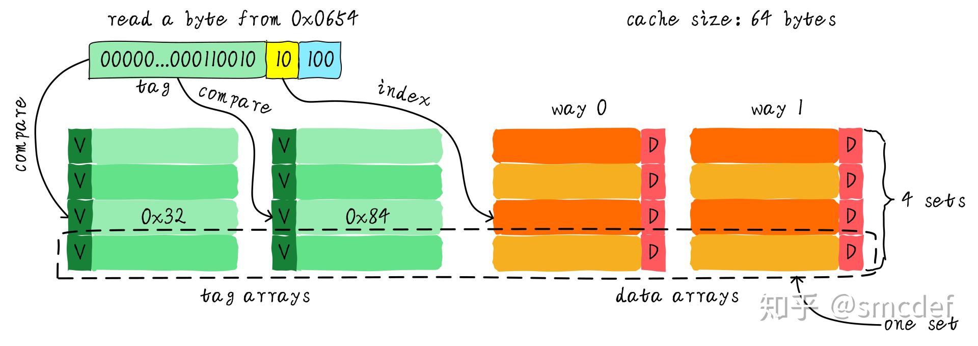 cache分成多个组set,每个组分成多个行way,linesize是cache的基本单位,从主存向cache迁移数据都是按照linesize为单位替换的。比如linesize为32Byte,那么迁移必须一次迁移32Byte到cache。 这个linesize比较容易理解,想想我们前面书的例子,我们从书架往书桌搬书必须以书为单位,肯定不能把书撕了以页为单位。书就是linesize。当然了现实生活中每本书页数不同,但是同个cache的linesize总是相同的。