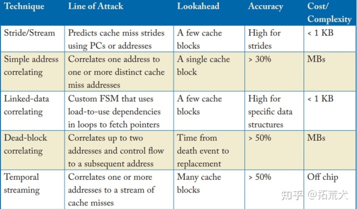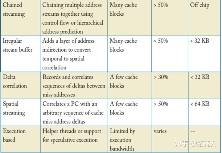 - Execution-based prefetching:不依赖于数据规律性/重复性,也不依赖于数据结构布局的基于执行的预取策略。这种策略会尝试在执行数据存取操作之前进行预取操作,利用CPU中的Stall周期和空闲的硬件资源,提前在执行之前把将要之前存取的指令地址提前在Cache中准备好,有点提前找打考试内容并打小抄的感觉。