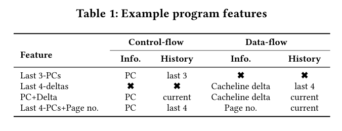 预取根据:program counter (PC), cacheline address (Address), page offset of a cacheline (Offset), or a simple combination of such features using simple operations like concatenation (+)