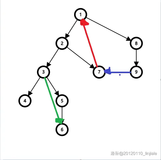 红边即为返祖边,因为它指向了当前节点 \(7\) 的祖先。