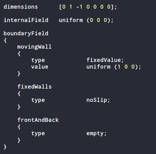假设顶部的壁面以每秒1 米的速度在x 方向移动,这是一个固定速度即fixedValue,其具体的值为uniform(1 0 0)。