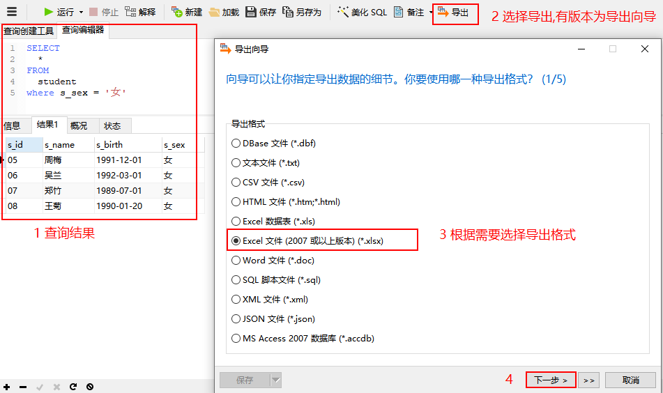 在查询结果页面选择连接工具的导出向导---->选择要到出的文件类型---->选择导出到指定位置指定文件即可