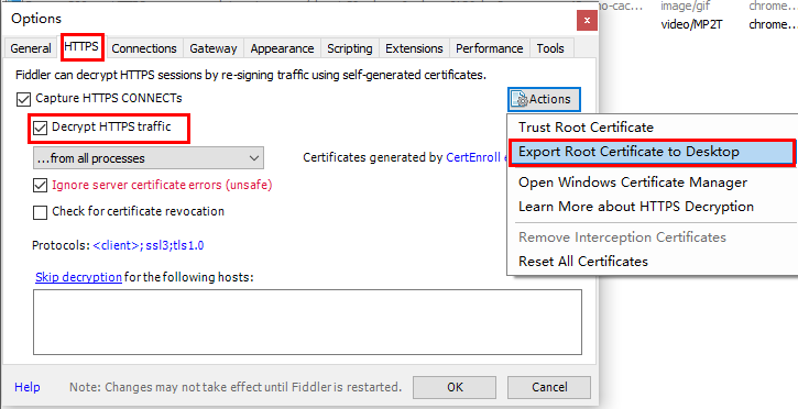 - Tools--->Options--->HTTPS--->勾选Decrypt HTTPS traffic--->Actions--->Export Root Certificate to Desktop--->FiddlerRoot.cer证书就会导出到桌面上