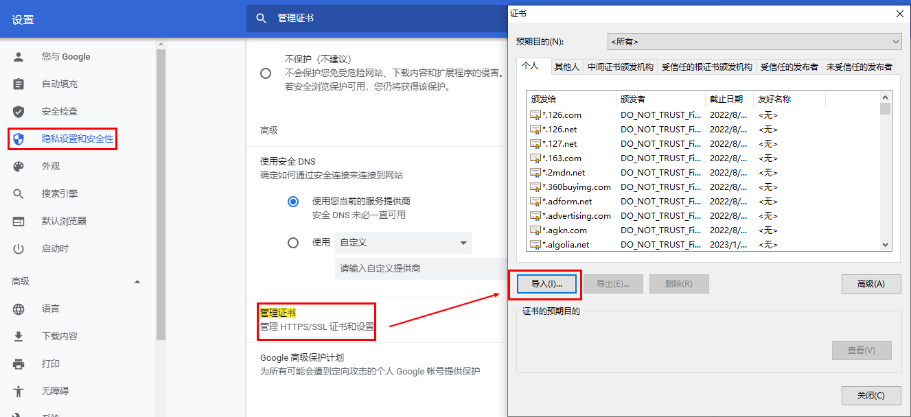 - 设置浏览器: Chrome--->设置--->高级--->证书管理--->导入--->导入桌面上的FiddlerRoot.cer证书--->OK