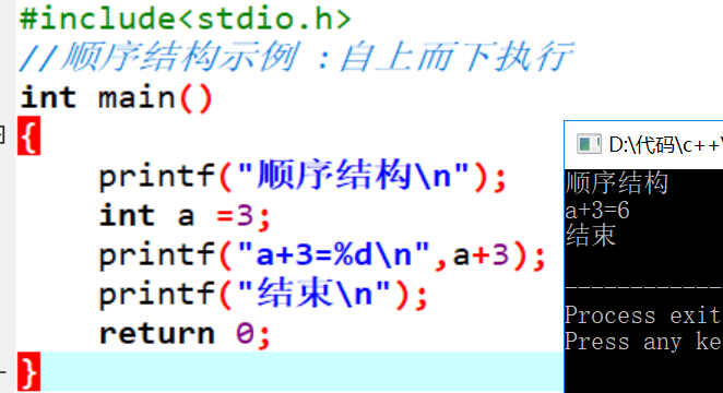 顺序结构 :顺序结构表示程序中的各操作是按照它们出现的先后顺序执行的。顺序结构的程序又称简单程序,这种结构的程序是顺序执行的,无分支,无转移,无循环,程序本身的逻辑很简单,它只依赖于计算机能够顺序执行指令(语句)的特点,只要语句安排的顺序正确即可。