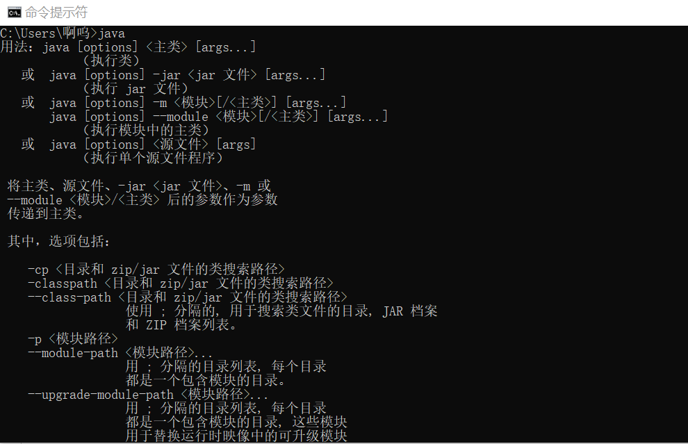 输入 java,出现一连串的指令提示,说明配置成功了: