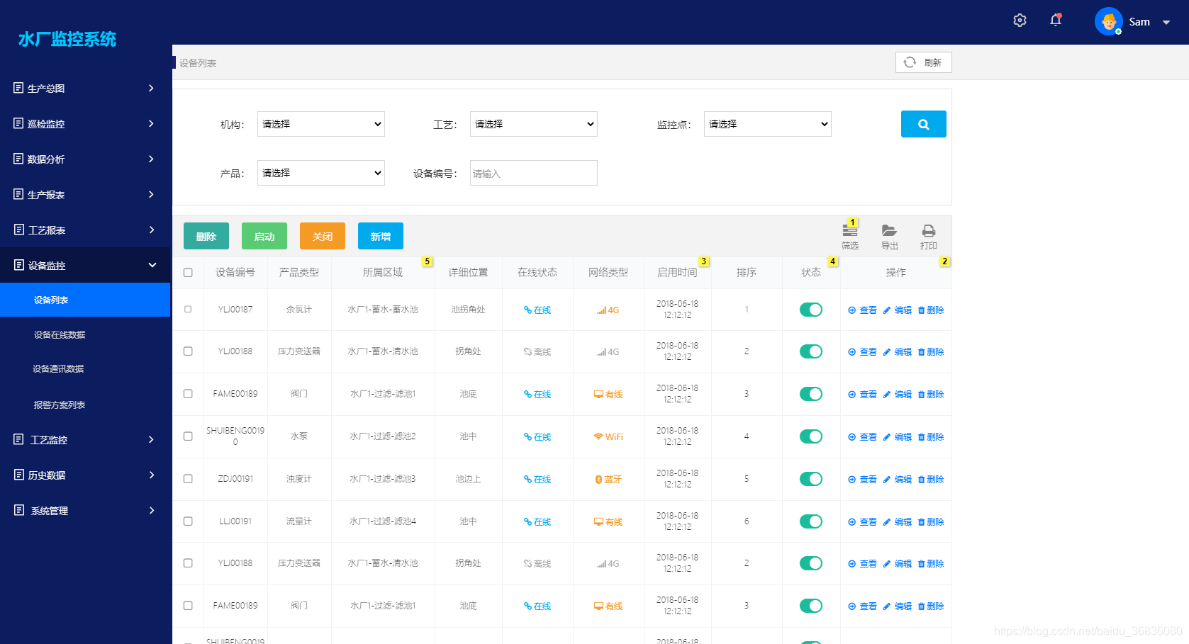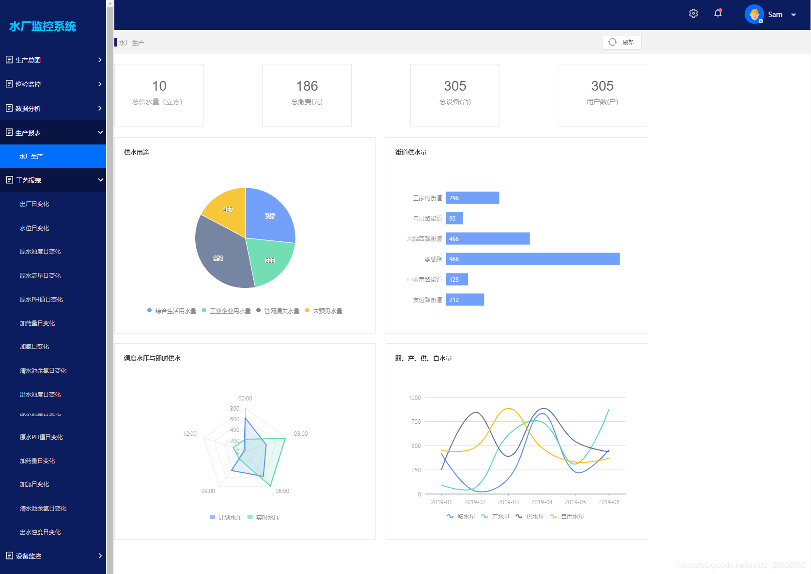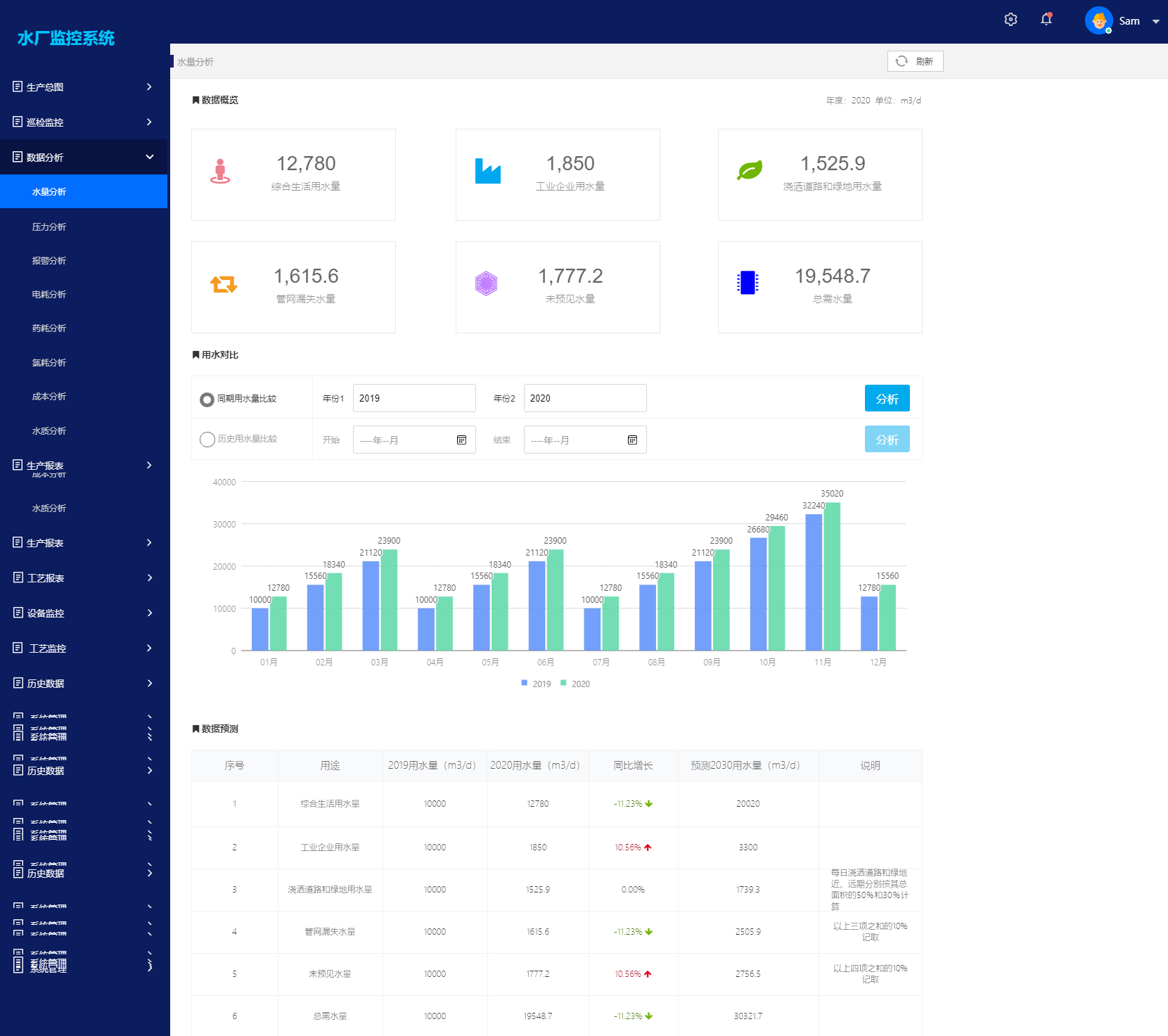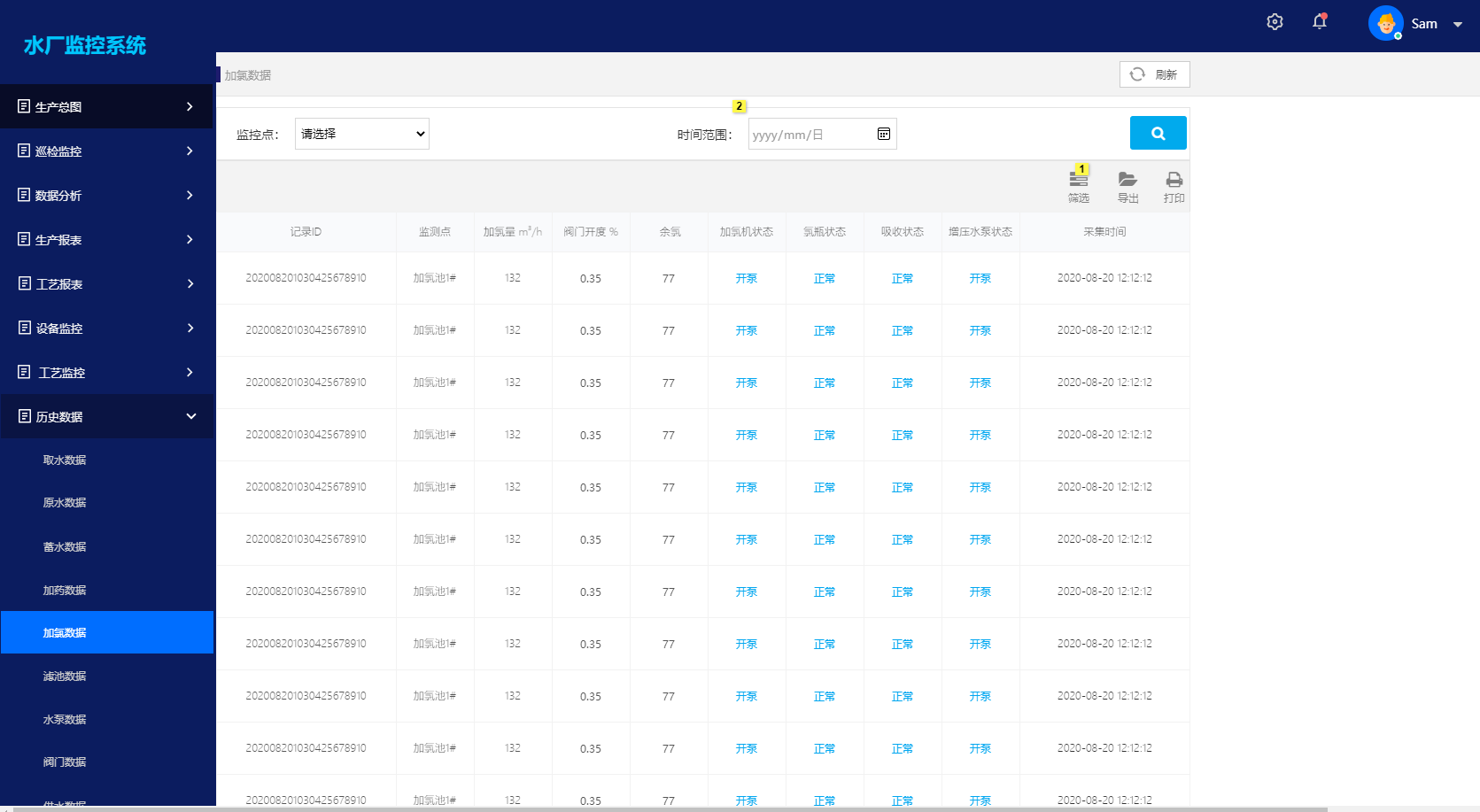 水厂监控系统、巡检监控、数据分析、生产报表、工艺报表、设备监控、水厂加药、工艺监控、水质分析、电耗、阀门、供水、冲洗、原水、加氯、蓄水、加药、滤池、沉淀池、配水井、氯耗、压力、浊度日、流量日、故障巡检