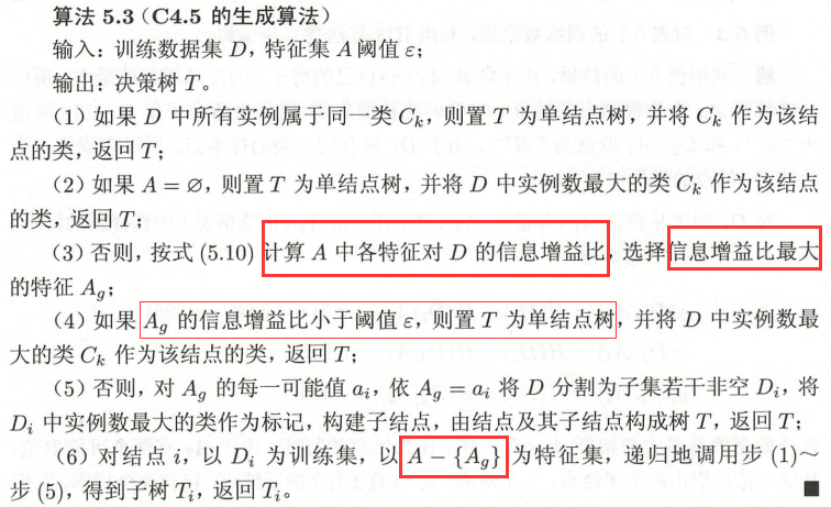 核心思路:在决策树各个结点上应用信息增益准则选择特征,递归地构建决策树。