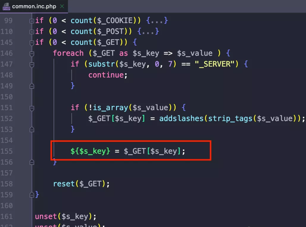 再介绍upload.php利用之前, 先讲一下通达OA祖传变量覆盖。这里有个坑就是, 有的解密工具会漏掉一个$, 导致掉了一键盘的头发也不明白变量覆盖在哪里… 因为该文件是common.inc.php, 可想而知大部分文件都有包含,大部分地方可以拿变量覆盖来进行操作。