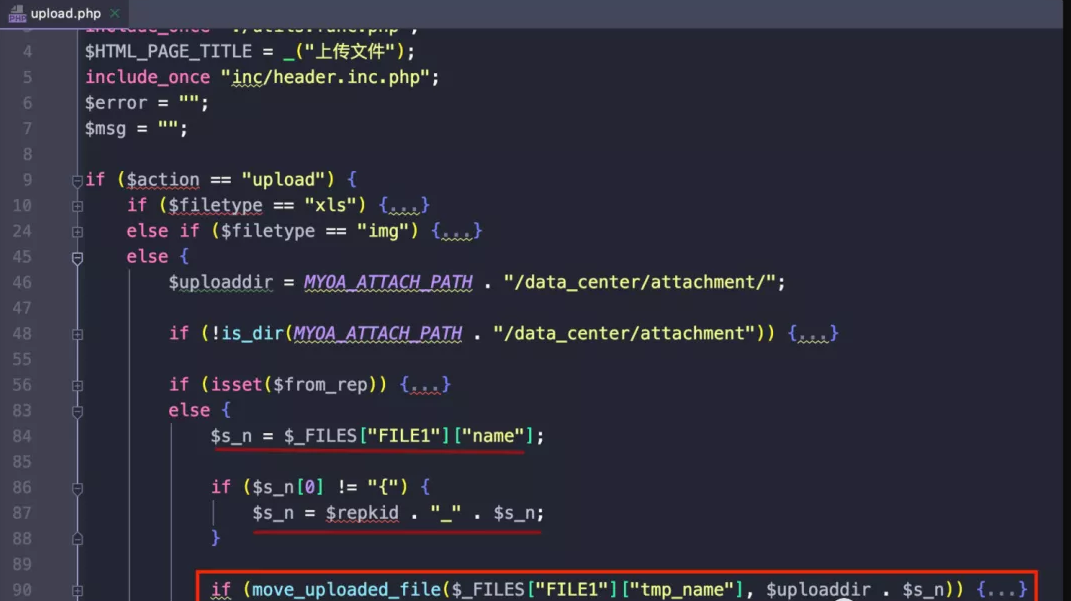 接着定位到上传点/general/data_center/utils/upload.php, 第9行变量覆盖action为upload盘进if,接着我们upload位置就是/data_center/attachment了。第84行变量覆盖s_n为我们的恶意文件, 90行upload位置拼接上s_n就是我们最终文件所在的位置。这里在87行变量覆盖repkid为../../../就能目录穿越将我们的马儿放在其他目录下, 至于为什么后面会说。
