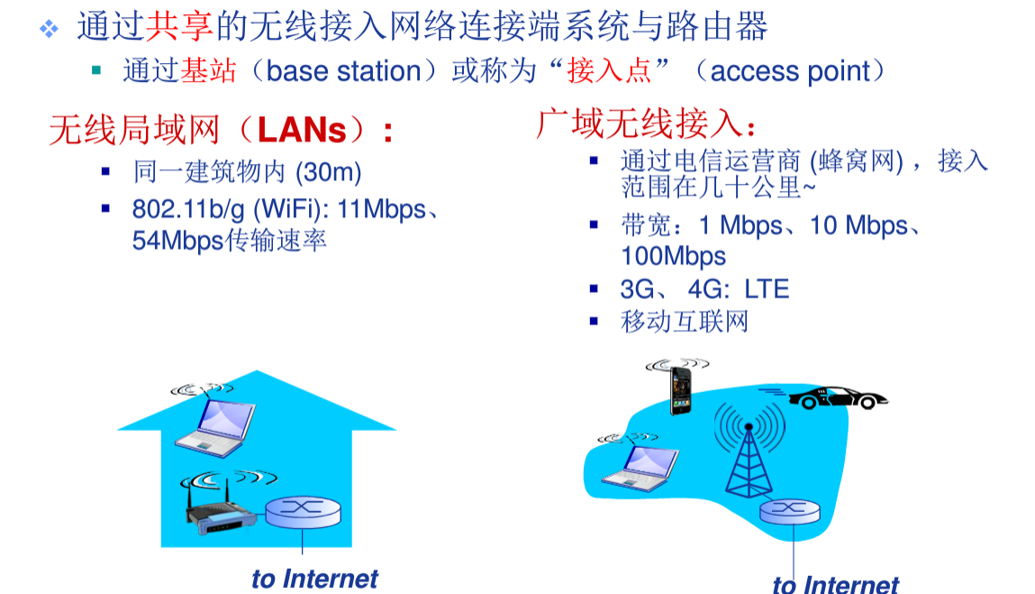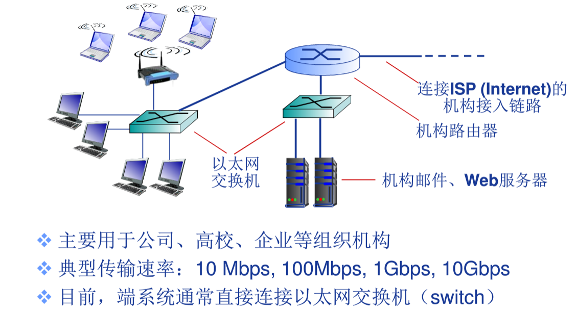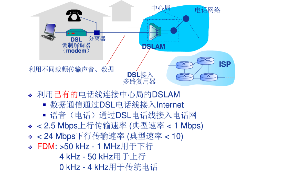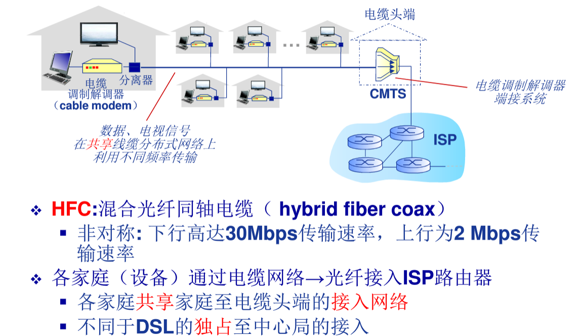 接入网络物理介质:数字用户线路,电缆网络,无线网络,家庭接入网络,机构接入网络。