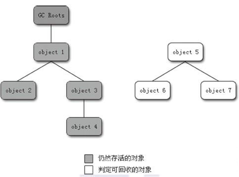 基本思想就是:从一个叫GC Roots的对象开始,向下搜索,如果一个对象不能到达GC Roots对象的时候,说明它已经不再被引用,即可被进行垃圾回收(此处 暂且这样理解,其实事实还有一些不同,当一个对象不再被引用时,并没有完全“死亡”,如果类重写了finalize()方法,且没有被系统调用过,那么系统会调用一次finalize()方法,以完成最后的工作,在这期间,如果可以将对象重新与任何一个和GC Roots有引用的对象相关联,则该对象可以“重生”,如果不可以,那么就说明彻底可以被回收了),如上图中的Object5、Object6、Object7,虽然它们3个依然可能相互引用,但是总体来说,它们已经没有作用了,这样就解决了引用计数算法无法解决的问题。