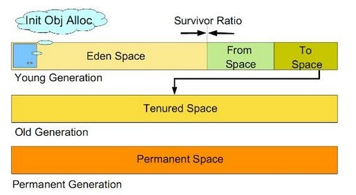 新生代:New Generation或者Young Generation。上面大致分为Eden区和Survivor区,Survivor区又分为大小相同的两部分:FromSpace 和ToSpace。新建的对象都是用新生代分配内存,Eden空间不足的时候,会把存活的对象转移到Survivor中,新生代的大小可以由-Xmn来控制,也可以用-XX:SurvivorRatio来控制Eden和Survivor的比例。