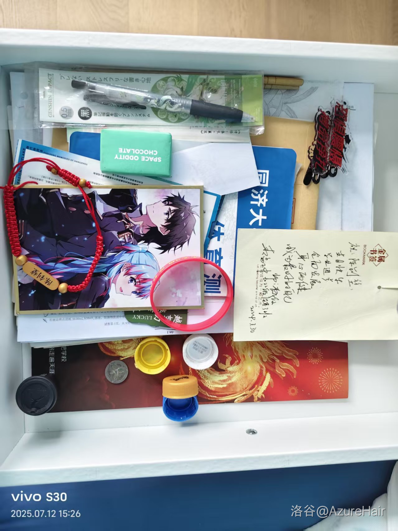 里面可以看到有 sby 送的纳西妲 diy 笔,打台球用的球杆(筷子),wjz 送的巧克力,家委会准备的高考加油手环和手链,ccj 给的生日贺卡,家委会送的磁力书签,打台球用的球,lxr 送的咖啡,奶龙送的珂朵莉立牌,写给自己的信,zzm 资助的恐惧震慑和搏命挣扎的发卡,初中时画的可蓉,珂朵莉,莉艾尔,艾瑟雅,奈芙莲,同济面试的标,高三全体教师的高考祝福,部分上面有哥们儿的善意留言的卷子,高一卷 oi 时打印的题,一些高三的大部分草稿纸。