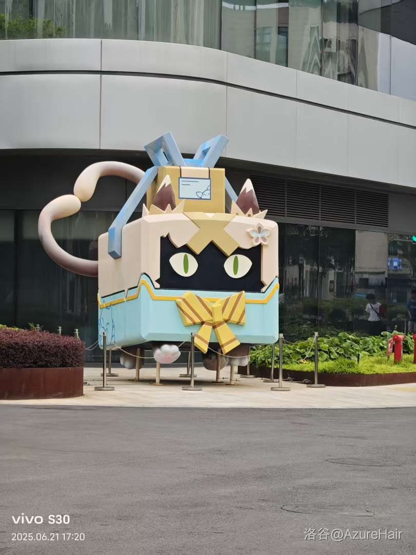然后体测立定跳远就正常体测,测完发现时间还早就想出去玩玩,但是此时 zzm, 哥们儿等人还都没面试结束,于是我就自己跑到豫园去玩,结果到了豫园门口发现豫园里人挤人,光剩看人了,就干脆没进去,灵机一动考虑去米哈游,于是就水灵灵的跑错了,跑到了米哈游的技术部,什么都没有什么都没看到,走了2公里多回到地铁站,又在地铁站里走了15分钟上地铁,重新前往正确的米哈游总部,并美美的拍了一个猫盒子(绮良良)