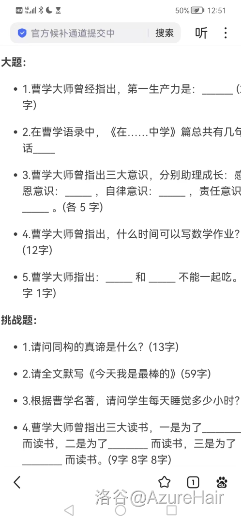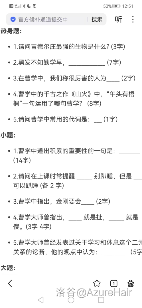 接下来的几天 zb 老师还请我们吃饭,请我们喝饮料,感谢 zb 老师让我白嫖了一堆饮料。接下来我们接了青岛二中2023男人八题的命题工作,我们命制了有史以来最简单的一套男人八题(只是因为我们太菜了出不出来难题),而我则开创了男人八题的新传统,即男人八题第九题,我在2023年那场加的是脑筋急转弯大汇总,以原神为背景,后来在24年的男人八题中继承了这个新传统,也出了娱乐题。