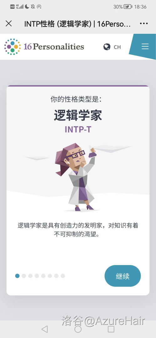 首先是在暑假期间,当时我还不知道关于人格测试的东西很流行,是在朋友的建议之下去测了一下,喜提INTP。