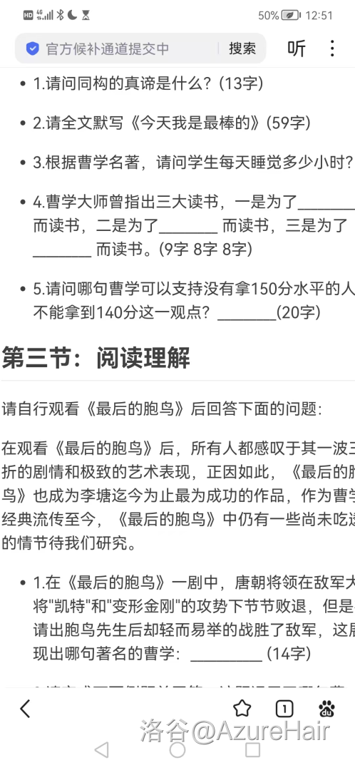 出我意料的是自己在考前并没有特别的紧张,虽然还是有明显的心跳加速等症状,但是最起码皮肤温度正常,然后不出意外的被语文创死了。