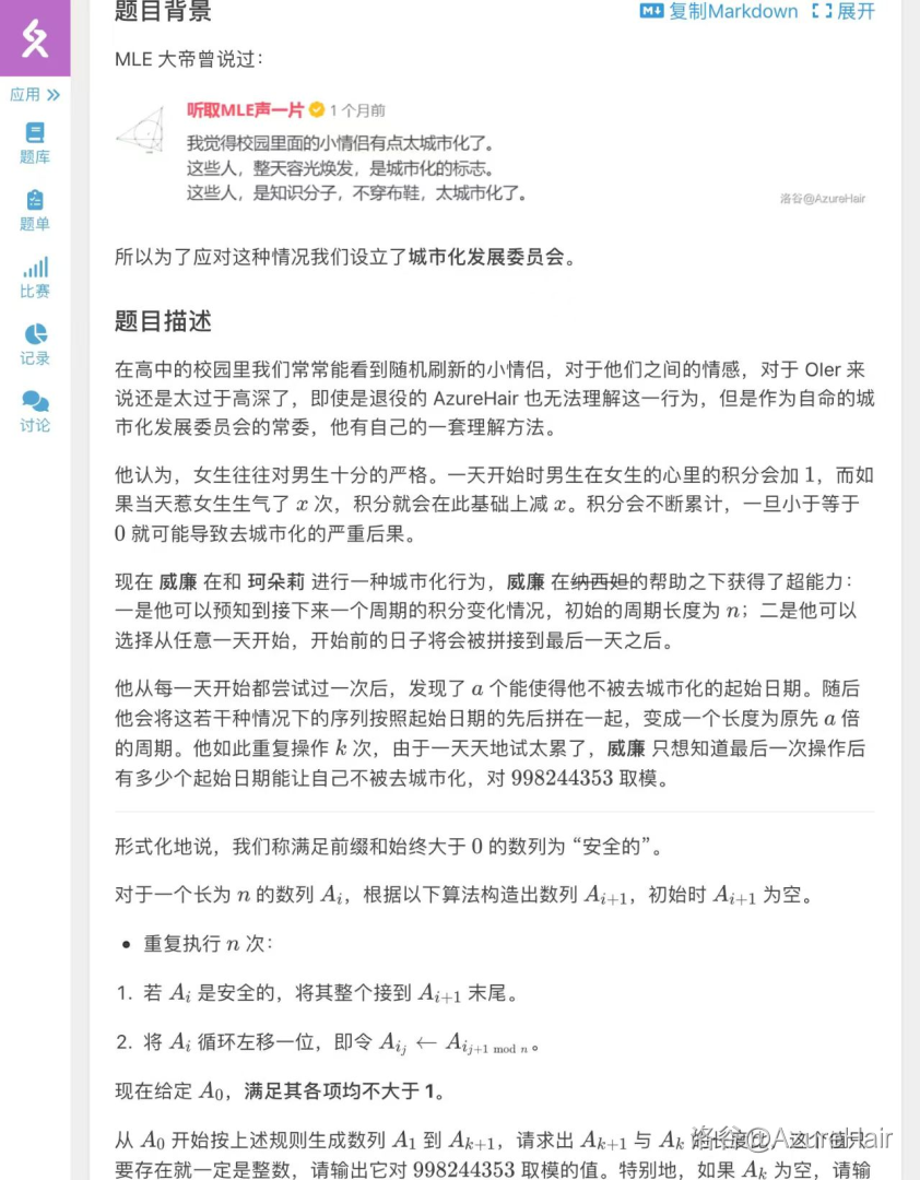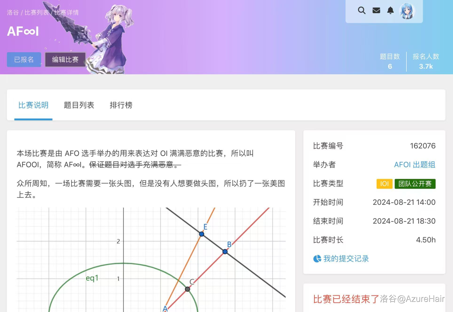 在 8 月,我们也如期举办了 AF∞I,圆了自己能在主题库里留下自己的题的梦想,虽然我全程鬼混,出的题也质量极低。