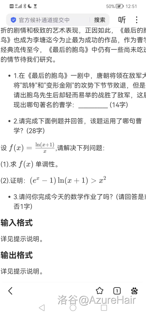 第三天上午物理,说实话当时考的时候就觉得怎么高中三年从来没做过这么简单的卷子,做到大题还有一个小时,15分钟速通第一第二大题,剩了 45 分钟做两个压轴题,结果倒数第二题简单的和那啥一样,15 分钟切了,就剩了最后一个大题,半个小时做一个题,第一问也很简单,第二问看起来比较抽象,但是经过不停的研究也是成功看明白了,直接开始猛猛算,我算的柿子都很好看,但是很奇怪的是中间有一步我等式两边的柿子部分刚好约掉了,以至于最后得出的答案是 \(ans\times 一段柿子=0\),于是我就算出位移是 0,我当时就觉得不对,但是又找不到哪里出问题了,于是相信相信的力量,直接去检查前面,后面考试结束和同学讨论的时候也是被狠狠嘲笑了(