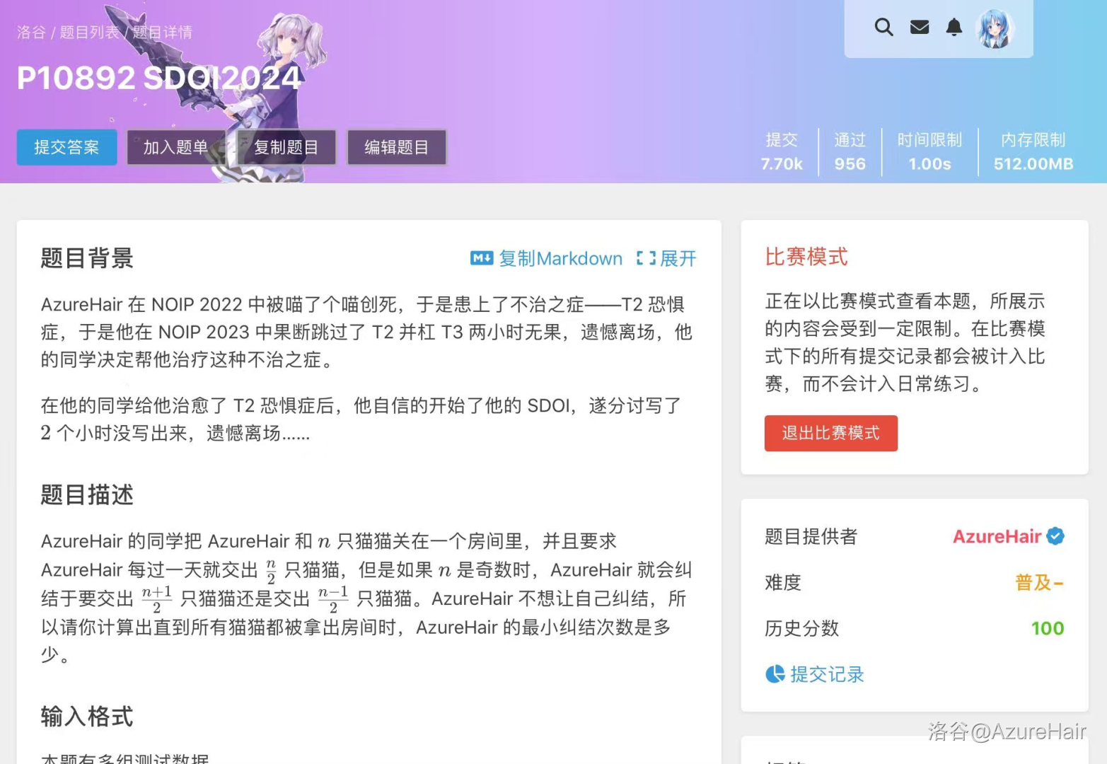 刚上高中时我的水平还停留在普及组的水平,整个初三虽然学着但是几乎一道题都没做过,进入二中时更是一道黄题自己都无法独立做出来,甚至说线段树都是在2022年10月学的。