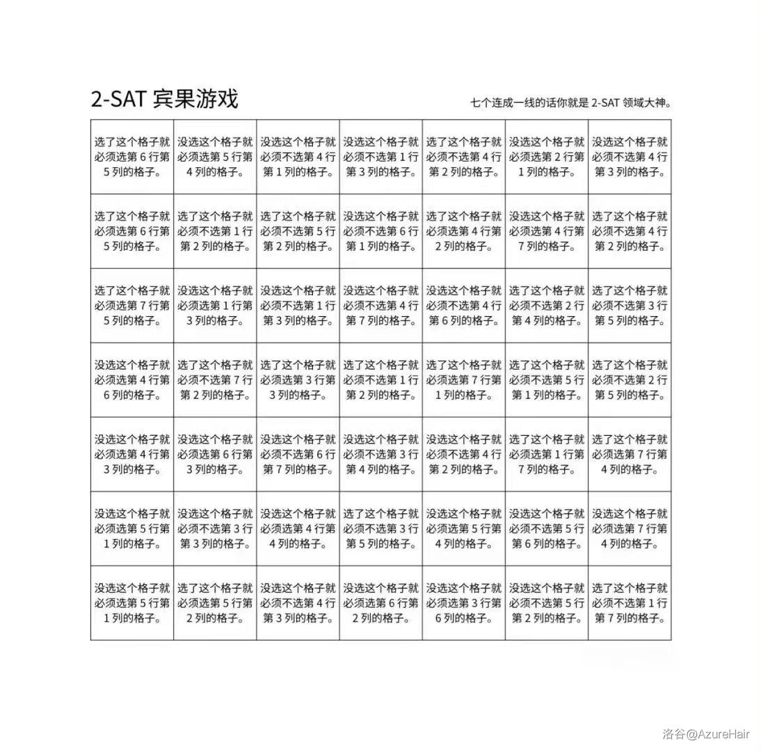 我也不知道有没有人会闲的没事去做做这个,反正我是看一眼就不想看第二眼。能做出来的都是 2-Sat 大神。