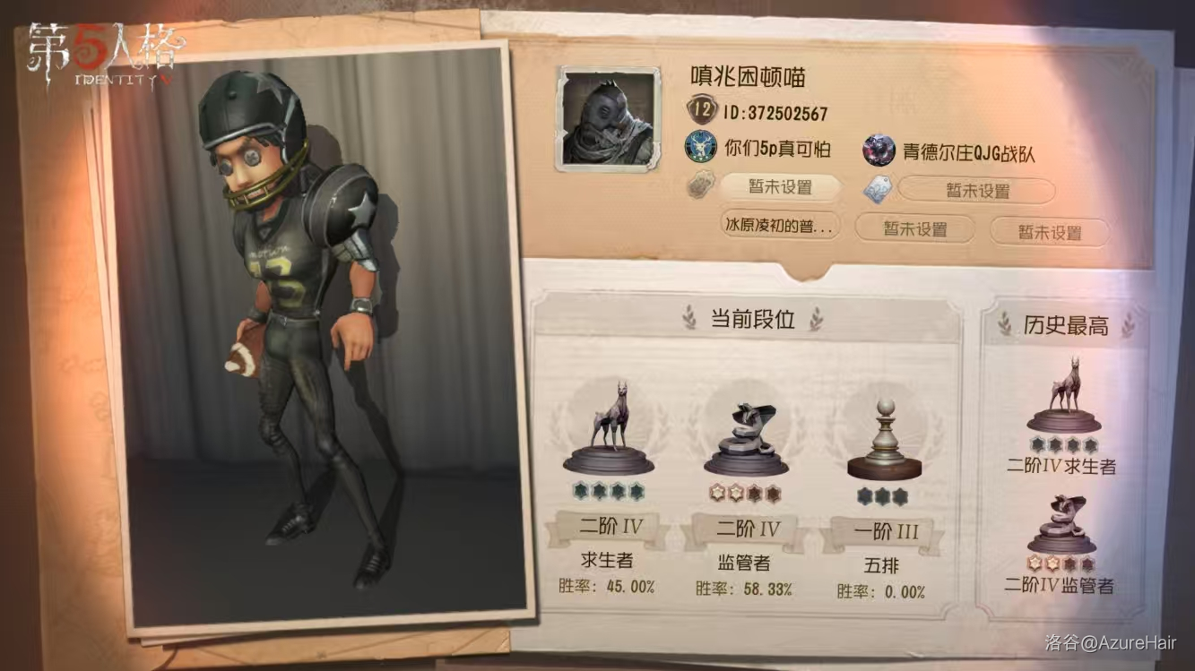然而现在这个同学自己不太玩第五人格了,他更是菜的扣脚,转点思路是从大空地转到大空地,监管常年胜率 20% 左右,也是个天赋型选手了。