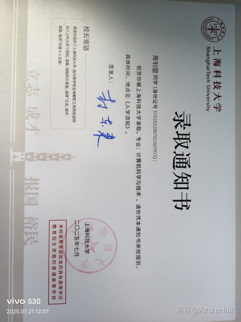 出结果那天也并没有什么意外,被上海科技大学录取,然后又得到消息,有信竞省一可以免试进入人工智能荣誉班,我就直接躺赢了,躺在过去的功劳簿上了。