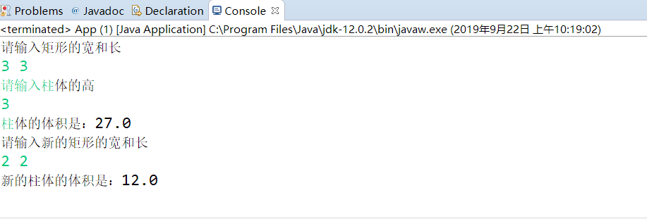 1 /** 2 * 1.文件功能:输入长宽高求柱体体积 换底再求体积 3 * 2.变量:A_1矩形1 A_2矩形2 B柱体 4 * 3.方法:主方法 5 */ 6 import java.util.*; 7 public class App { 8 9 public static void main(String[] args) { 10 Rectancle A_1 = new Rectancle(); 11 RectangularCylinder B = new RectangularCylinder(); 12 //创建矩形 柱体对象 13 B.setRec(A_1); 14 15 Scanner in = new Scanner(System.in); 16 System.out.println("请输入矩形的宽和长"); 17 double h_1 = in.nextDouble(); 18 double w_1 = in.nextDouble(); 19 A_1.setHeight(h_1); 20 A_1.setWidth(w_1); 21 22 System.out.println("请输入柱体的高"); 23 double h_2 = in.nextDouble(); 24 B.setHeight(h_2); 25 26 A_1.Area(); 27 28 System.out.println("柱体的体积是:"+B.CalVolume()); 29 30 31 Rectancle A_2 = new Rectancle(); 32 33 System.out.println("请输入新的矩形的宽和长"); 34 double h_3 = in.nextDouble(); 35 double w_2 = in.nextDouble(); 36 A_2.setHeight(h_3); 37 A_2.setWidth(w_2); 38 39 A_2.Area(); 40 B.setRec(A_2); 41 42 System.out.println("新的柱体的体积是:"+B.CalVolume()); 43 } 44 45 }