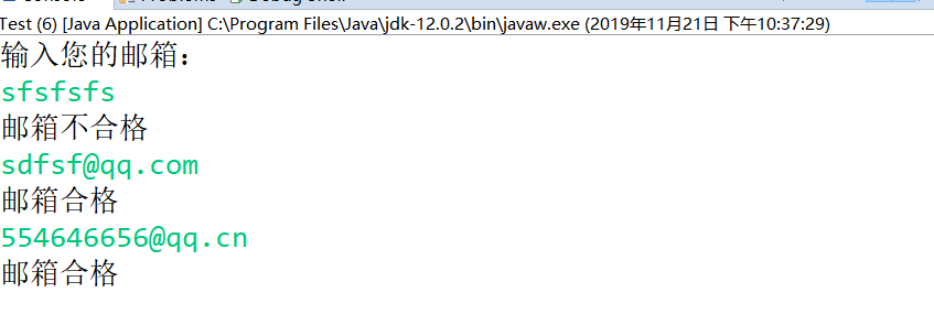 1 import java.util.*; 2 public class Test { 3 4 public static void main(String[] args) { 5 // TODO Auto-generated method stub 6 Scanner in = new Scanner(System.in); 7 System.out.println("输入您的邮箱:"); 8 9 while(in.hasNext()) { 10 String str1 = in.next(); 11 String str2 = "[a-zA-Z0-9-_]+@[a-zA-Z0-9]+(.com|.cn)"; 12 13 if(str1.matches(str2)) 14 System.out.println("邮箱合格"); 15 else 16 System.out.println("邮箱不合格"); 17 } 18 } 19 20 }