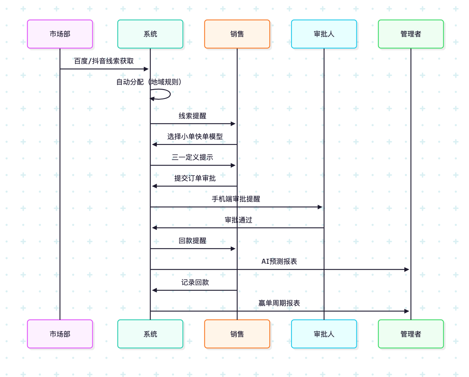 流程闭环是CRM的核心价值——从线索获取到回款的全链路自动化,避免“线索流失、阶段遗漏、审批延迟”。需覆盖线索分配、阶段推进、审批、提醒、预测五大环节。